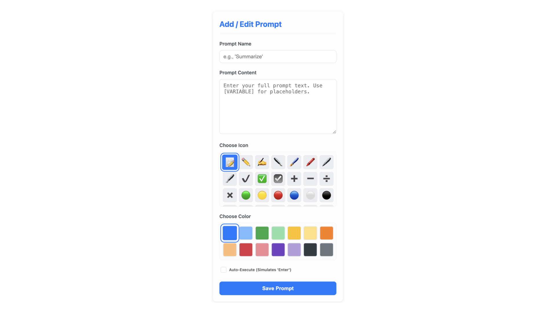 An optional "auto-execute" setting to immediately send your prompt, simulating pressing 'Enter'.